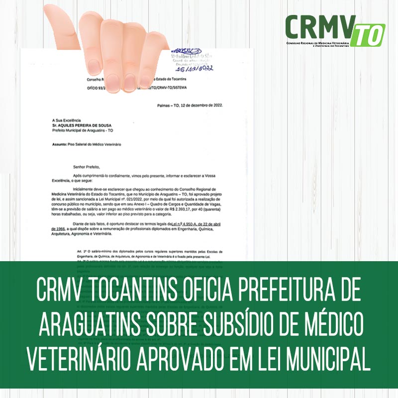 A diretoria do CRMV – Conselho Regional de Medicina Veterinária do Tocantins entregou na manhã desta quinta-feira, dia 15 de dezembro, documento oficial informando à Prefeitura Municipal de Araguatins, sobre o salário anunciado em Anexo de Lei Municipal que autoriza Concurso Público para a vaga de médico-veterinário. O valor que seria proposto, segundo o Anexo, seria de R$ 2.393,17, para 40 horais semanais, quantia inferior ao piso previsto para a categoria.