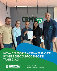 A presidente em exercício do Conselho Regional de Medicina Veterinária do Tocantins (CRMV-TO), Nilda Francisco Costa, recebeu na tarde desta quinta-feira, 16 de outubro, o sucessor e os membros da Diretoria da próxima gestão (2025/2028) para a assinatura do Termo de Posse. Conforme previsto na Resolução da Eleição, a assinatura ocorre 30 dias antes do início da nova gestão, que terá início no próximo dia 23 de novembro.